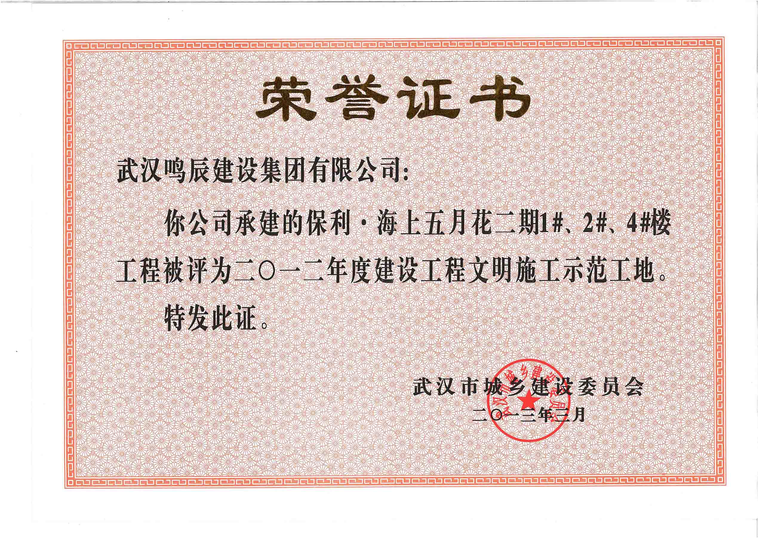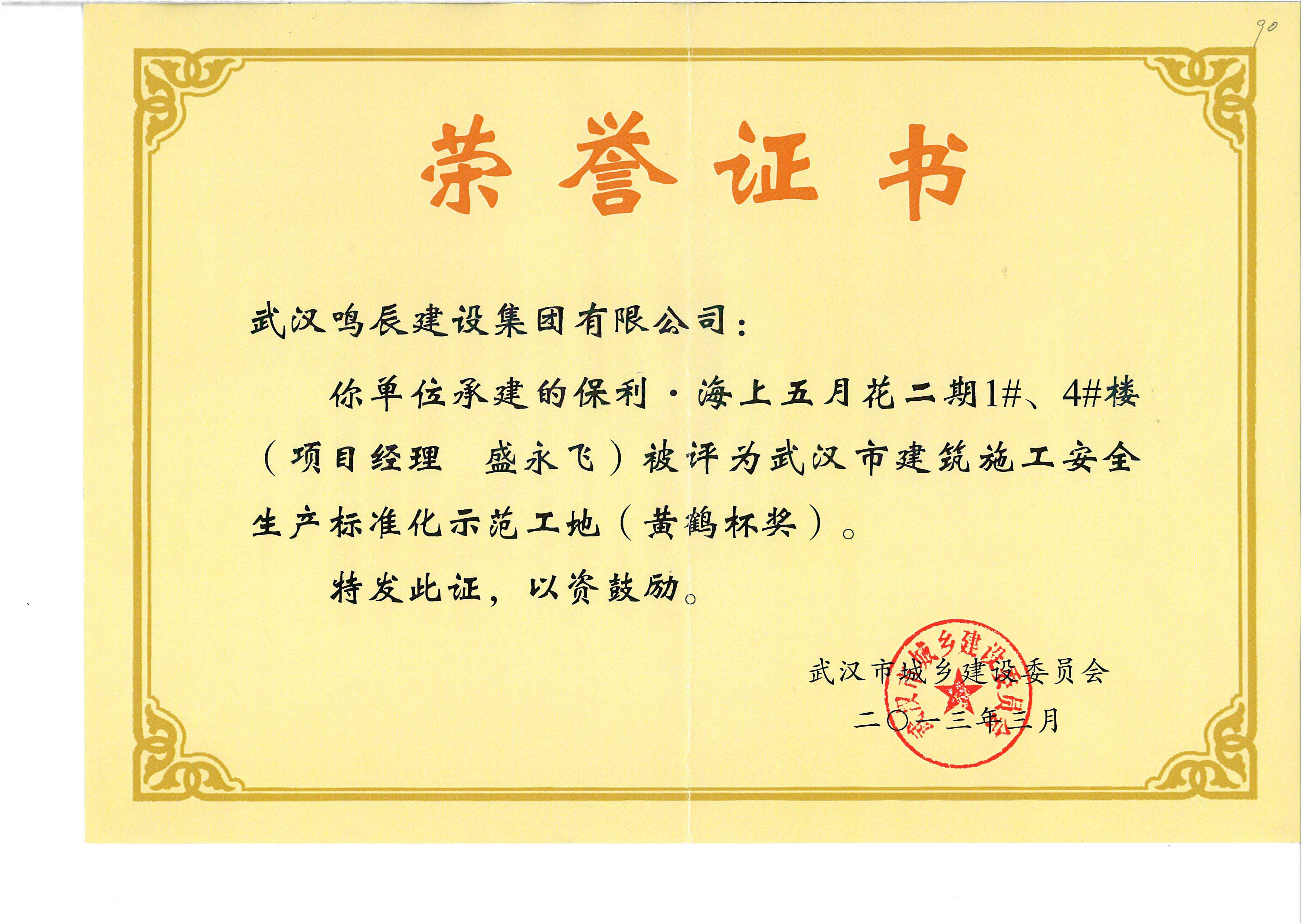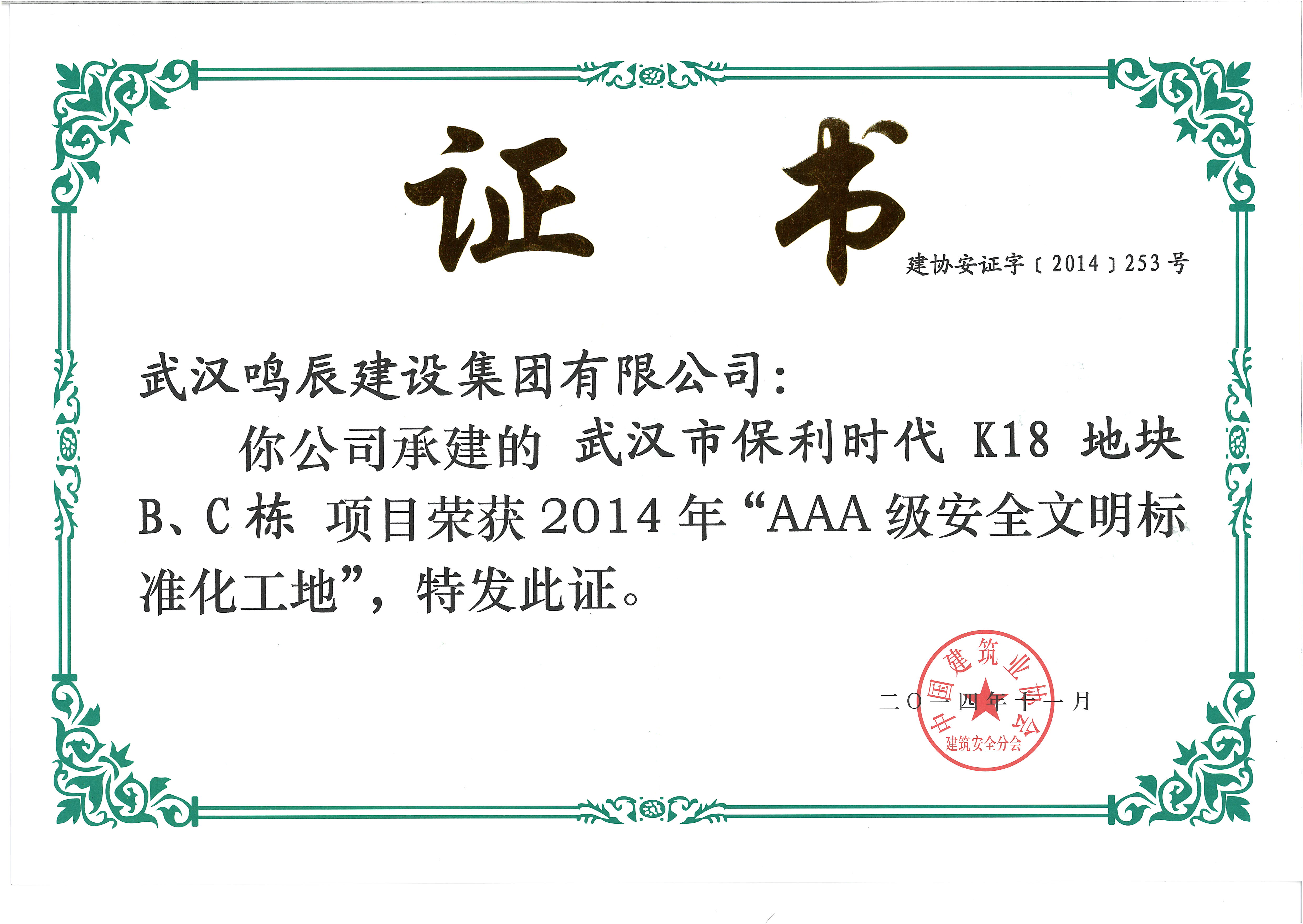 武漢市建筑施工安全生產(chǎn)標(biāo)準(zhǔn)化示范工地(黃鶴杯獎(jiǎng))