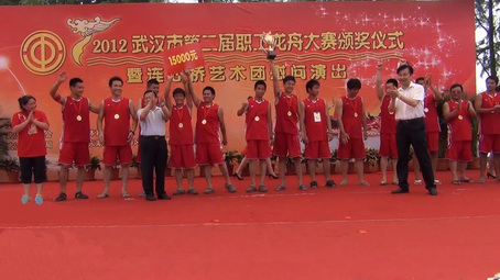2012年6月22日至6月24日武漢市第二屆職工龍舟賽在武漢東湖聽(tīng)濤景區(qū)舉行。此次龍舟大賽旨在慶??偣?huì)成立90周年、弘揚(yáng)中華民族龍舟歷史文化、豐富全市職工精神文化體育生活,是一場(chǎng)以“弘揚(yáng)中華龍舟文化、展現(xiàn)武漢城市精神”為競(jìng)賽主題的全民大賽。24日,東湖聽(tīng)濤景區(qū)鼓聲陣陣,我市第二屆職工龍舟大賽在激烈的角逐中落下帷幕。江漢大學(xué)海博龍舟隊(duì)和江岸區(qū)總工會(huì)鳴辰集團(tuán)分別以2分8秒和2分49秒獲得了22人制和10人制龍舟的第一名。10人制龍舟賽率先進(jìn)行,江岸區(qū)總工會(huì)鳴辰集團(tuán)一馬當(dāng)先,保持絕對(duì)優(yōu)勢(shì),江漢區(qū)宏興代表隊(duì)、東湖風(fēng)景區(qū)地方稅務(wù)局位于二、三名。
