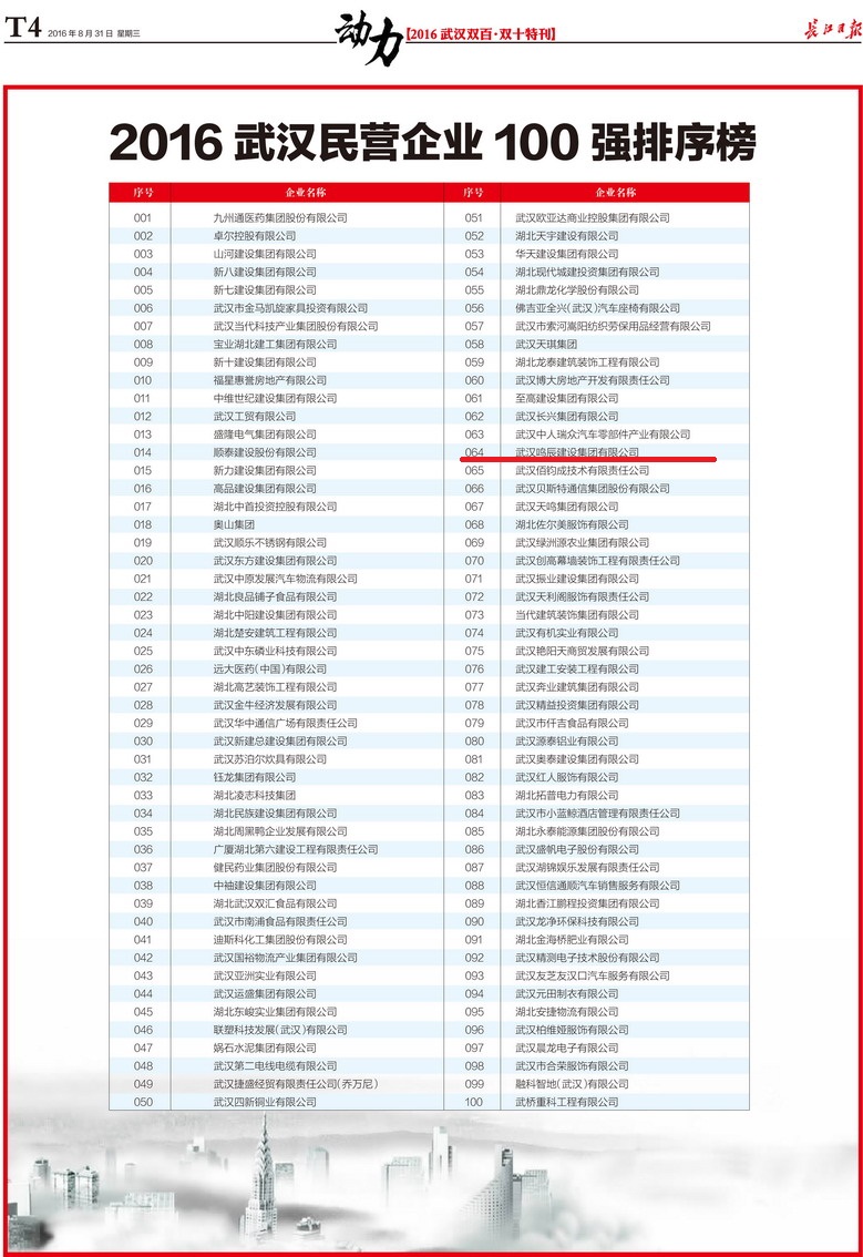 武漢鳴辰建設(shè)集團(tuán)有限公司在“2016年武漢雙百強(qiáng)企業(yè)評(píng)比”中榮獲“武漢民營企業(yè)100強(qiáng)”稱號(hào),相關(guān)新聞:http://cjrb.cjn.cn/images/2016-08/31/20/2016083120_pdf.pdf