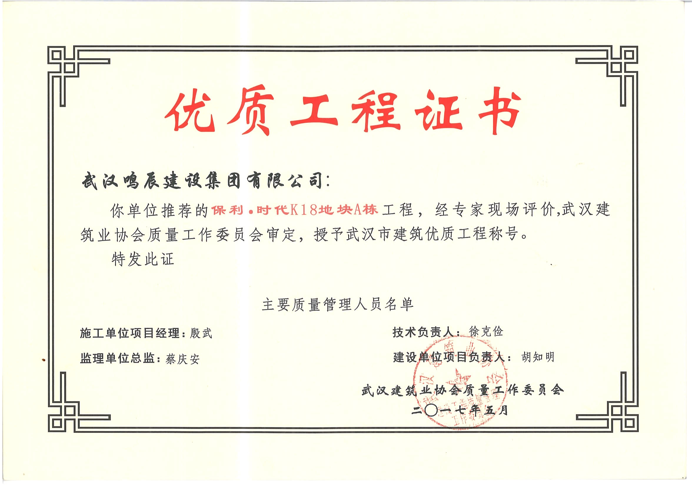 保利時(shí)代K18地塊A棟工程榮獲武漢市優(yōu)質(zhì)工程榮譽(yù)
