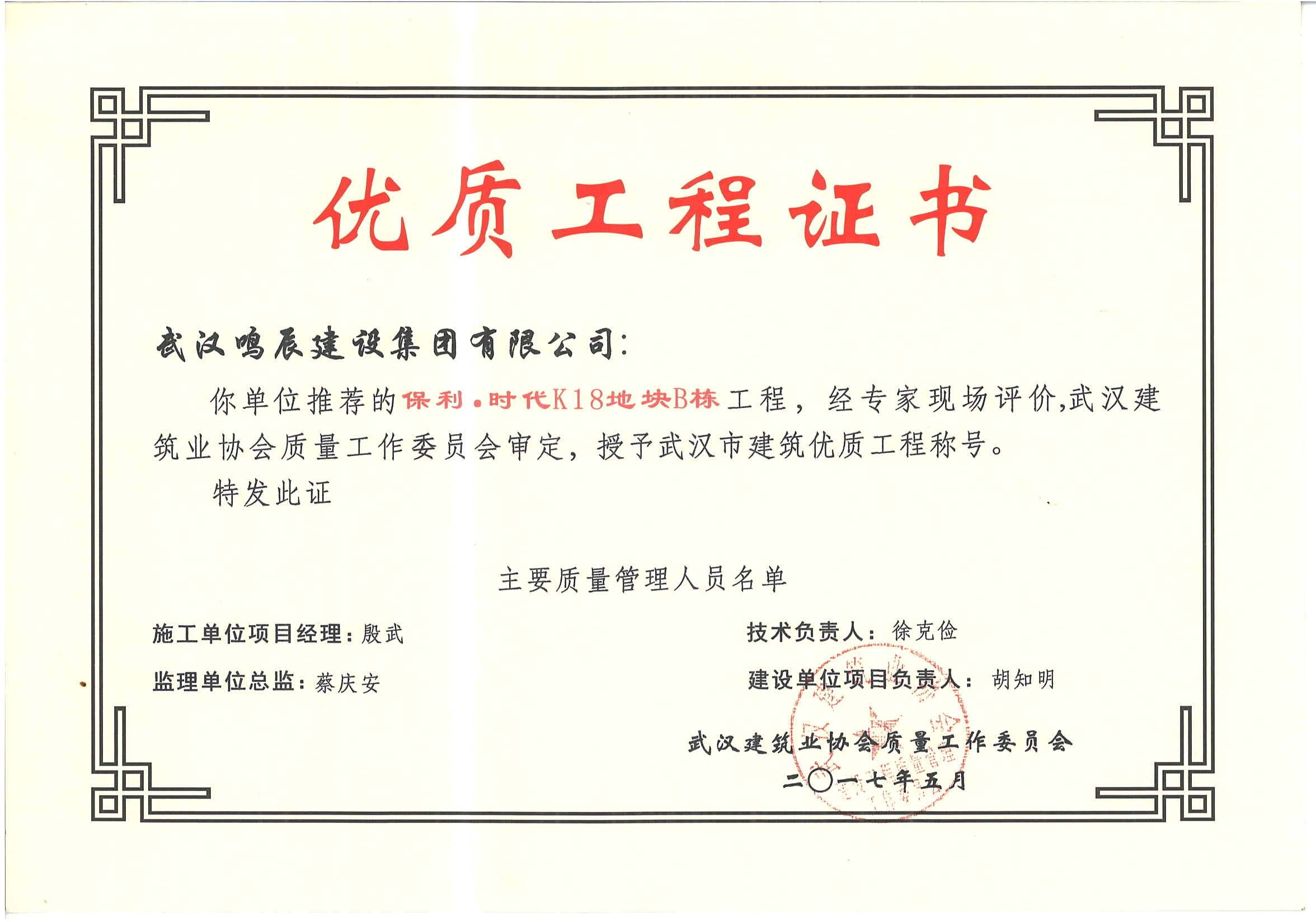 保利時(shí)代K18地塊工程B棟榮獲武漢市優(yōu)質(zhì)工程榮譽(yù)