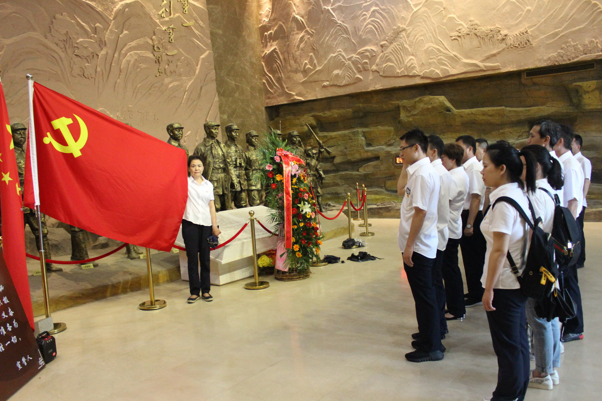 在宣化店中原突圍紀念館大廳,黨委副書記凃敏同志主持了紀念活動。黨委書記王春才同志、黨委委員張惠忠同志向革命先烈敬獻了花籃。黨委組織委員胡萍同志帶領(lǐng)全體共產(chǎn)黨員面向黨旗重溫了入黨誓詞。紀念館里,一份份珍貴的史料和生動的解說,仿佛再現(xiàn)了那段光輝的歷史,讓大家緬懷先烈、重溫歷史的同時堅定了理想信念。