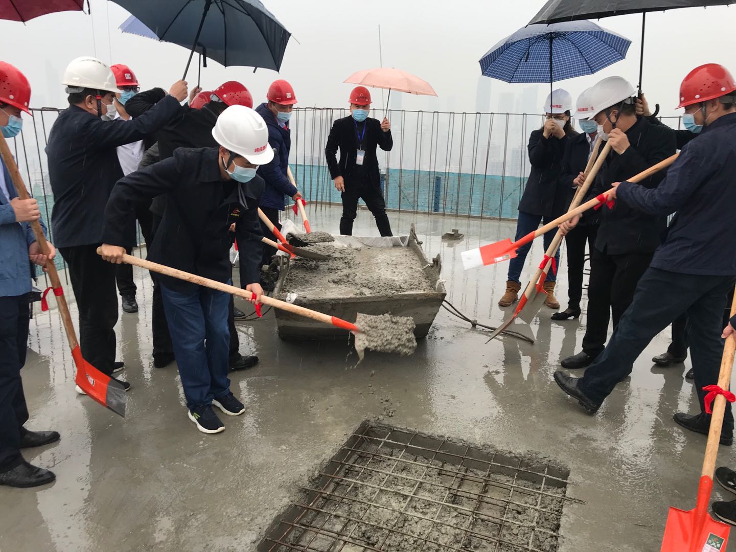中海集團公司李總和江總與武漢鳴辰建設集團有限公司黨委書記王春才同志、總經(jīng)理張惠忠同志共同為鳴辰集團中海澳門佳園工地澆筑最后一方混凝土,標志著該項目順利封頂。