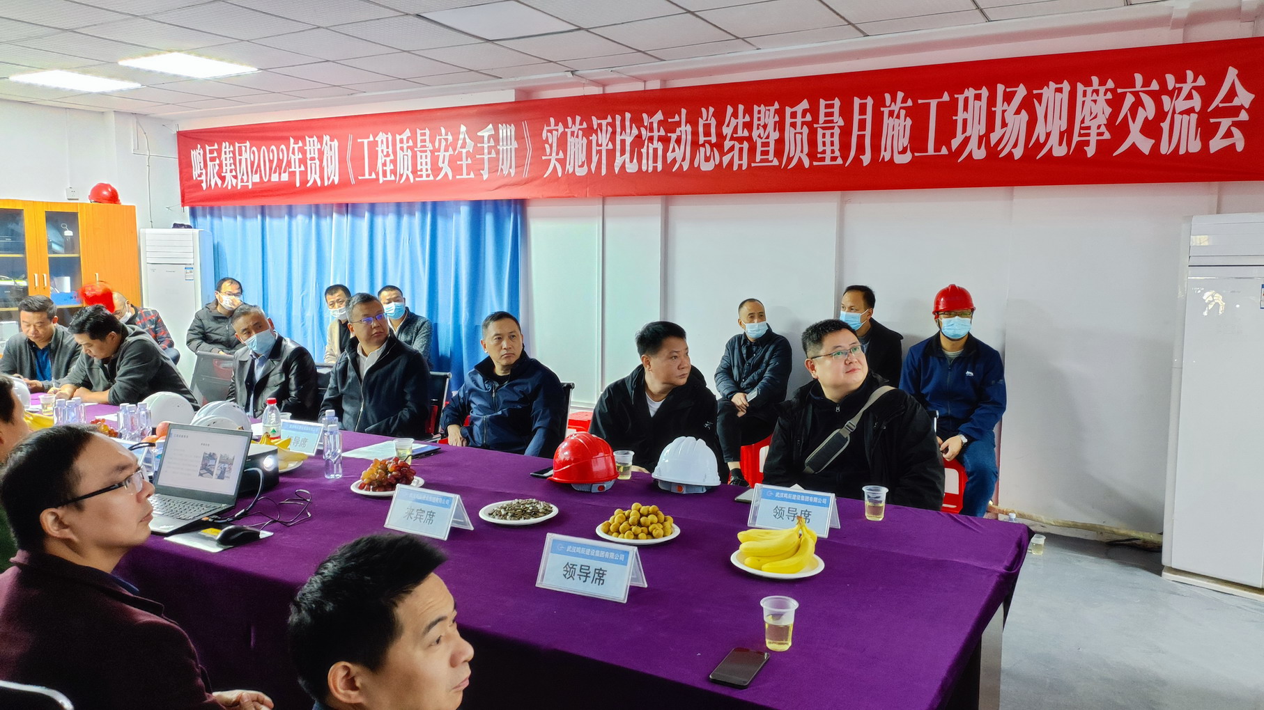 2022年11月19日上午,武漢鳴辰建設(shè)集團(tuán)有限公司貫徹《工程質(zhì)量安全手冊(cè)》實(shí)施評(píng)比活動(dòng)總結(jié)暨質(zhì)量月施工現(xiàn)場觀摩會(huì)在長江航道局檔案館項(xiàng)目圓滿舉行。江岸區(qū)建管站長王衛(wèi)綱、副站長彭勇,長江航道局整治中心工程處副處長黃偉,集團(tuán)公司總經(jīng)理張惠忠、集團(tuán)公司領(lǐng)導(dǎo)班子成員及集團(tuán)公司項(xiàng)目部代表參加觀摩活動(dòng)。